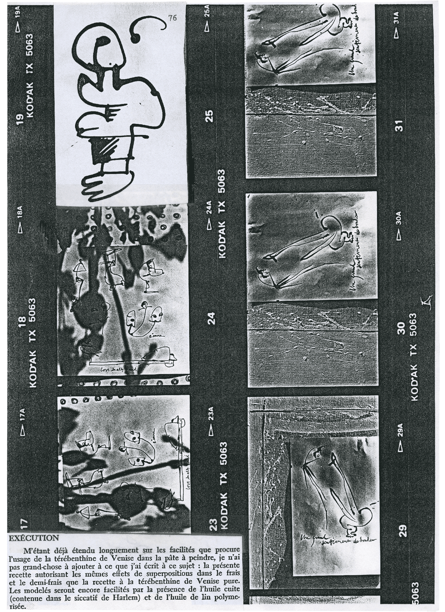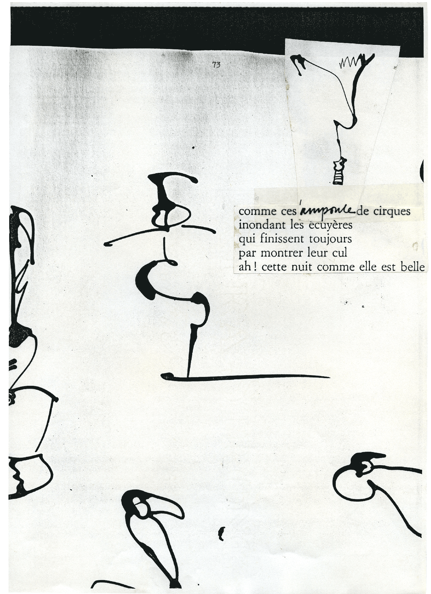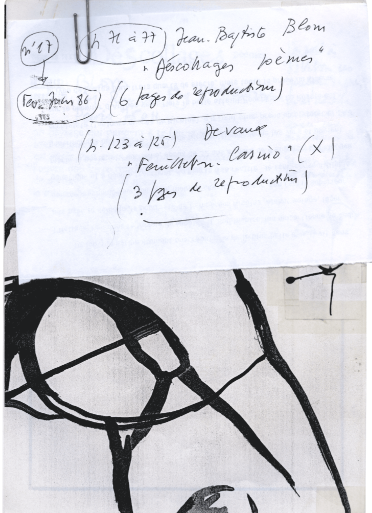 6 feuilles A4 – 21 x 29,7 cm. Collages, photocopies, dessins à l’encre, textes dactylographiés.