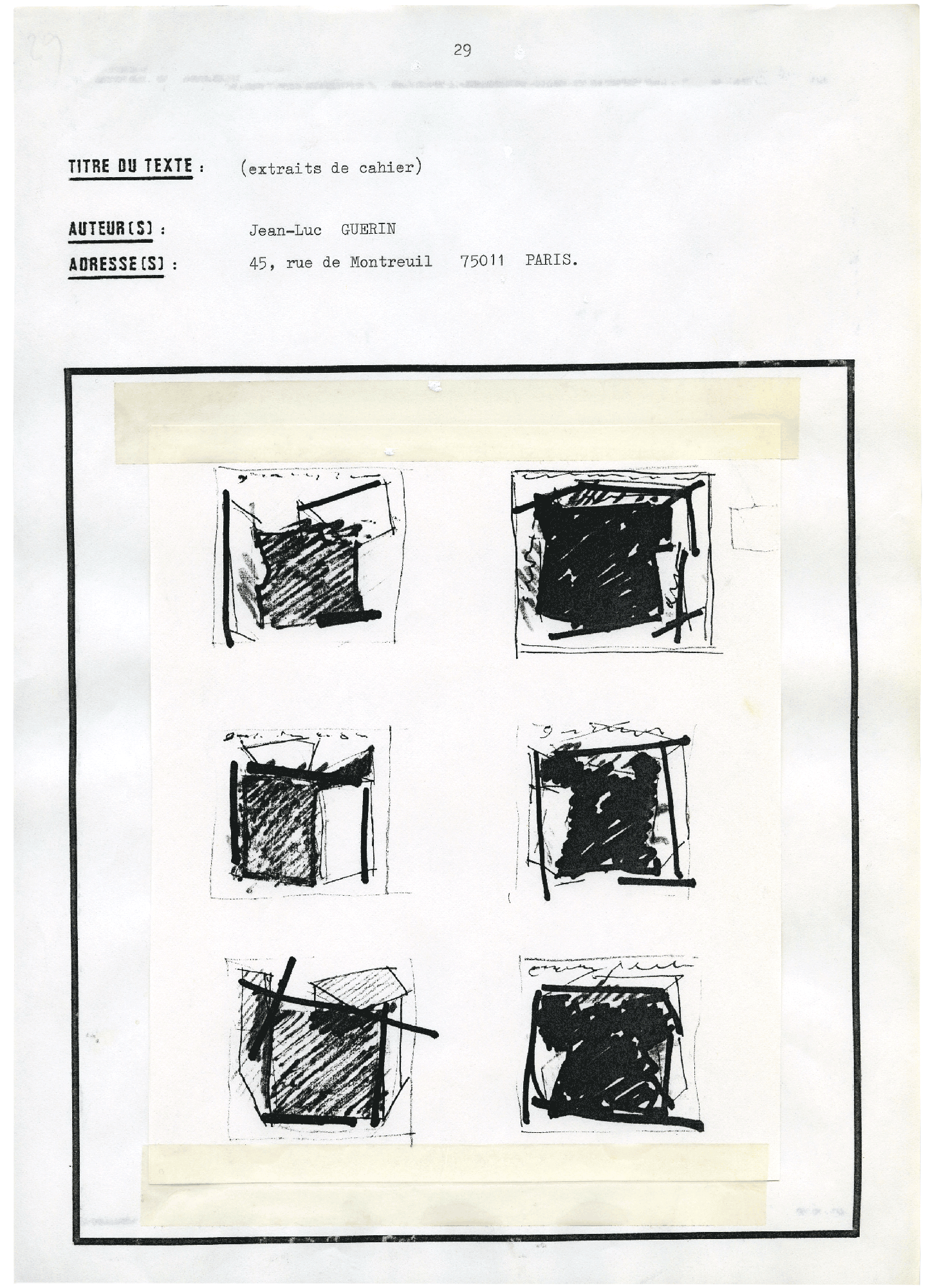 7 feuilles A4 – 21 x 29,7 cm. Collages, dessins, CV dactylographié.
