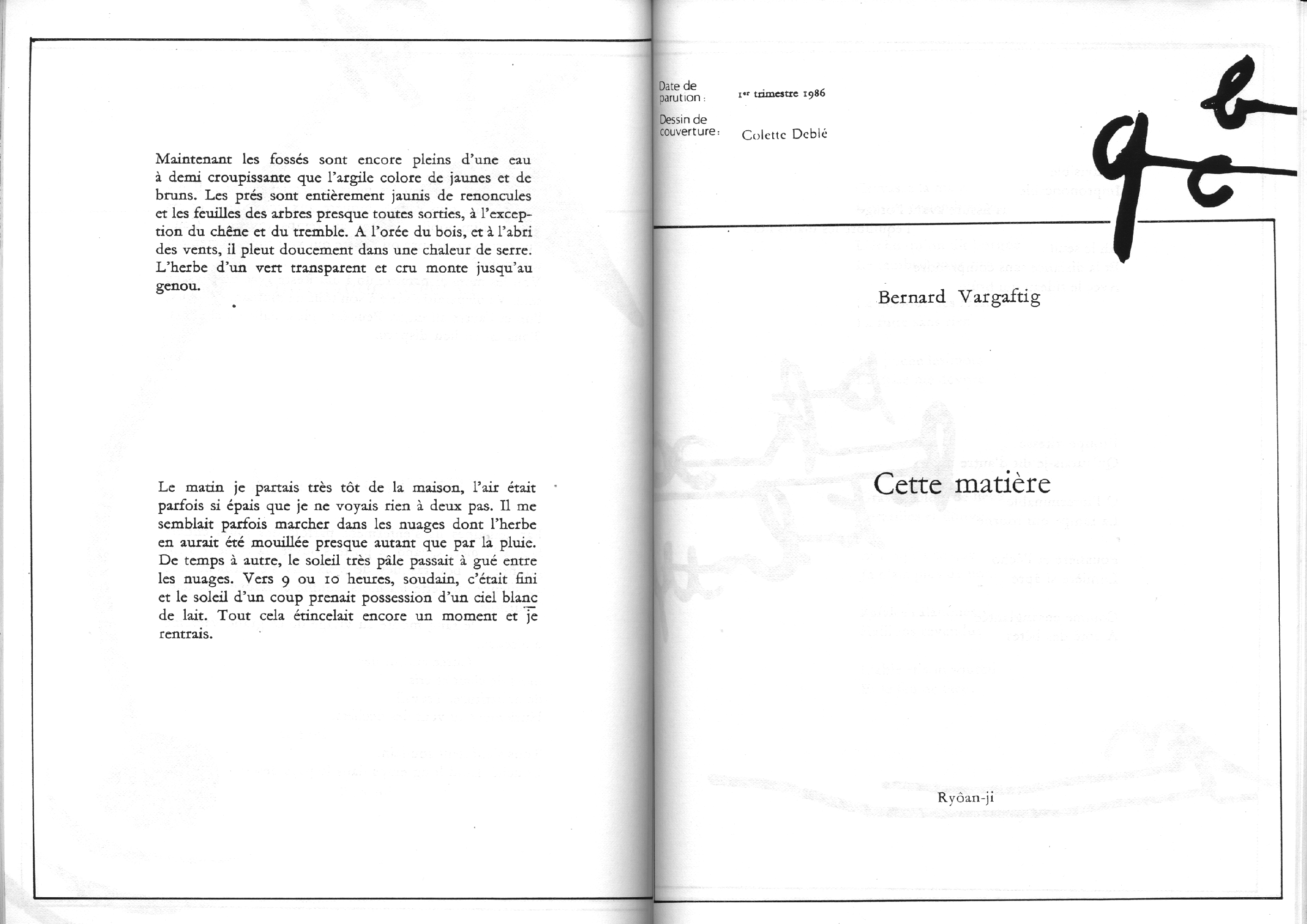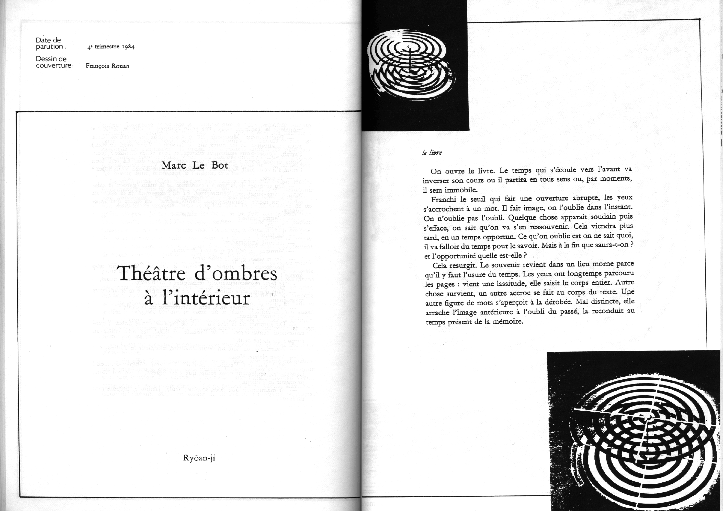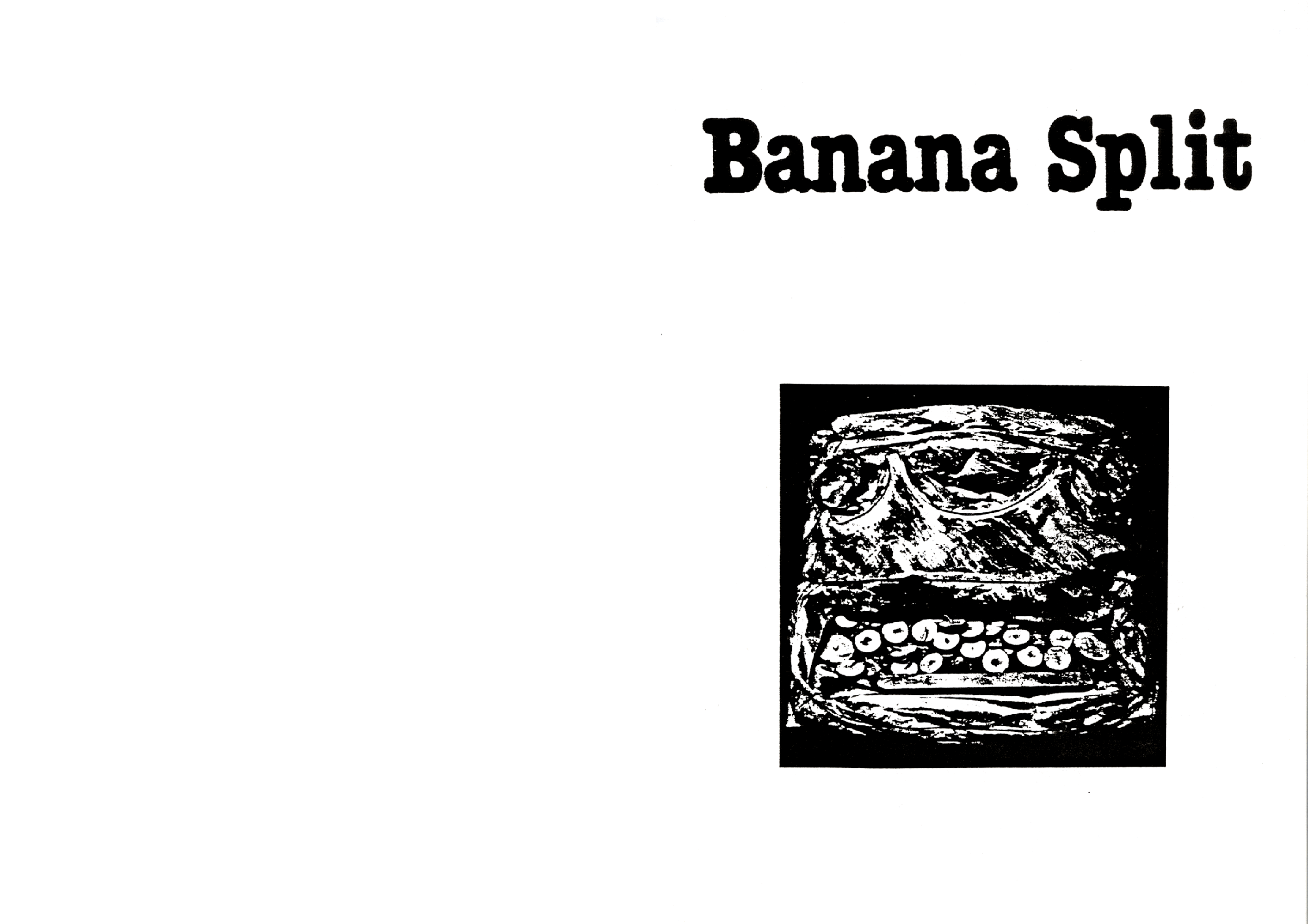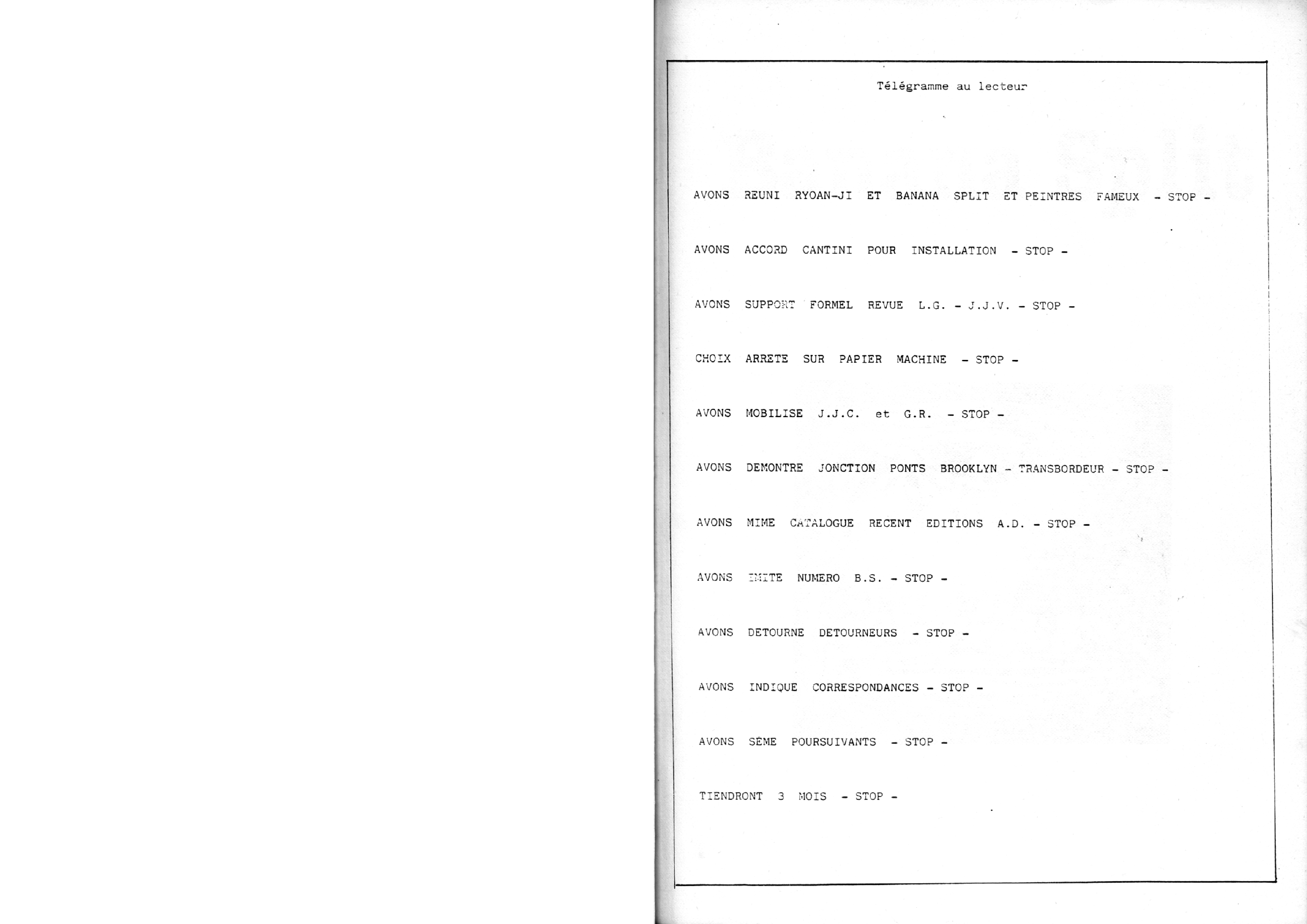 Catalogue d’exposition, numéro spécial de la revue Banana Split. Introduction de Marc le Bot – réunion de Ryoan-Ji et Banana Split, oeuvres de Jean-Jacques Ceccarelli, Olivier Debré, Jean Degottex, Fred Deux, Pierre Klossowski, Bernard Moninot, Roman Opalka et Jan Voss. In-4 (295×210), broché, 85 pages papier machine.