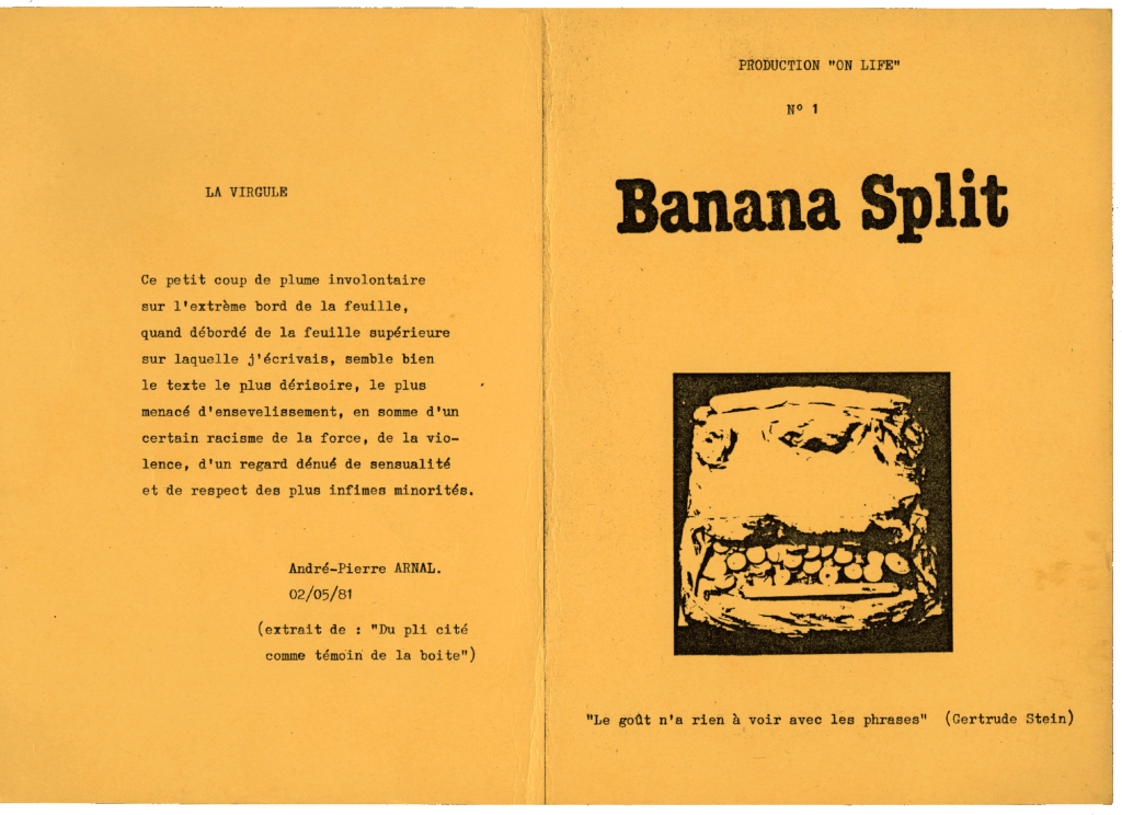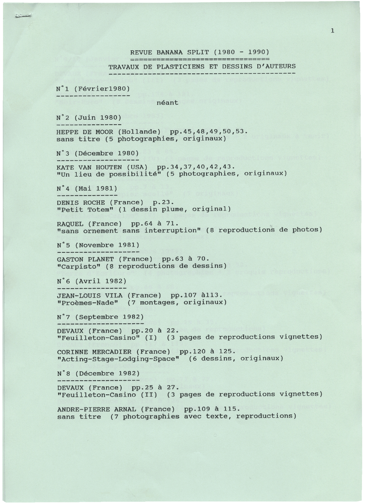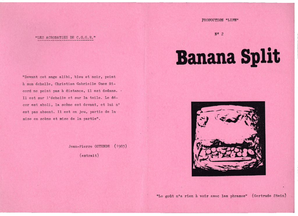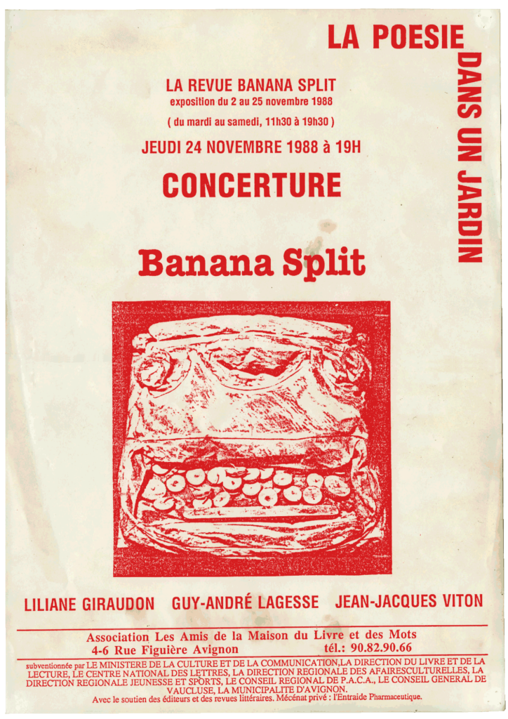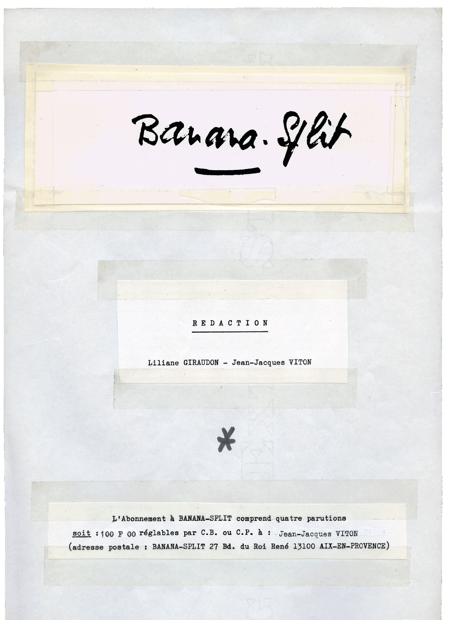 ARCHIVE BANANA SPLIT : UNE ARCHIVE ACCESSIBLE Archive Banana Split est une publication des Editions Salon du Salon qui répertorie l'ensemble des contributions de plasticien.ne.s à la Revue Banana Split, fondée et menée par Liliane Giraudon et Jean-Jacques Viton entre 1980 et 1990.