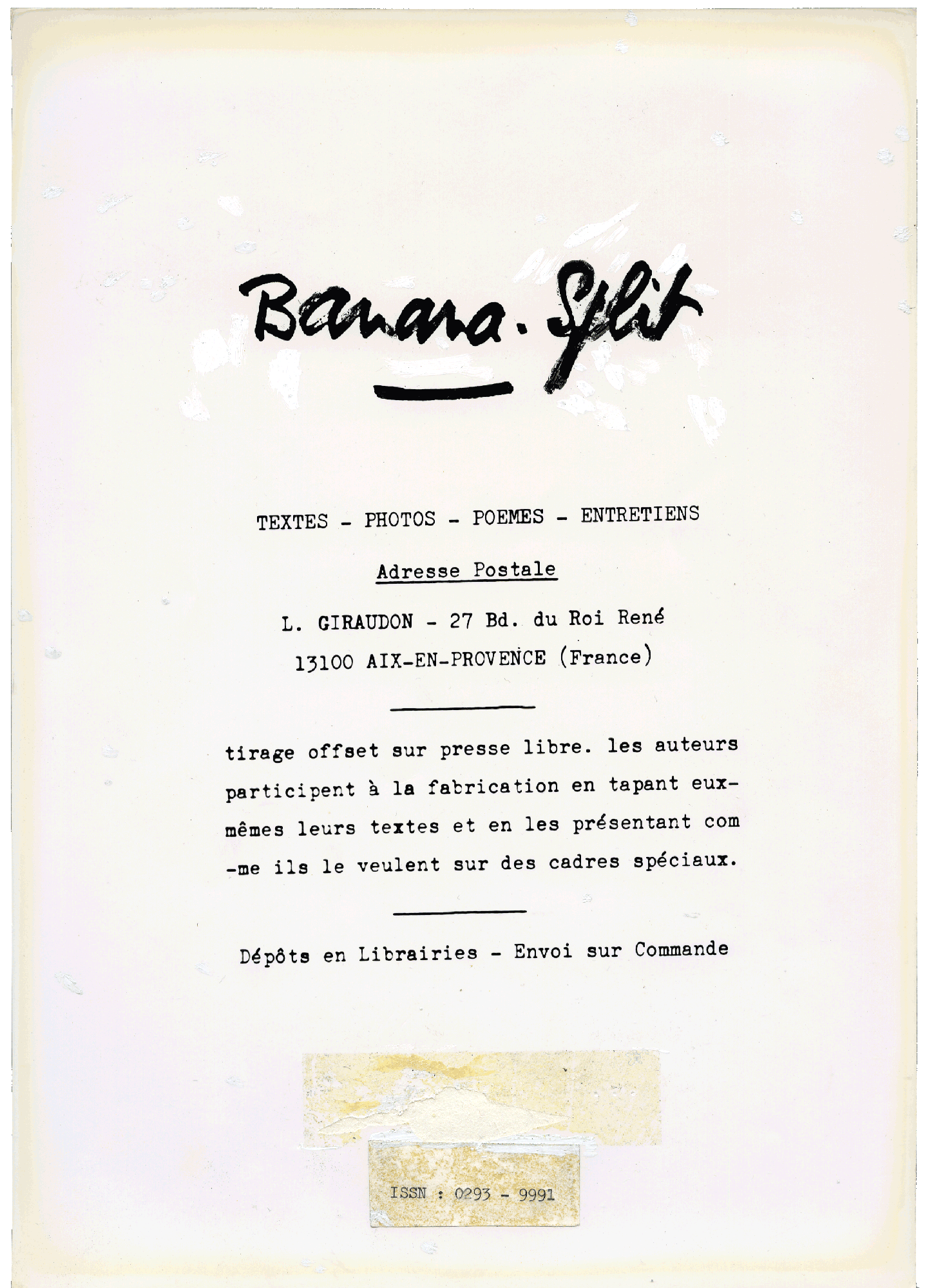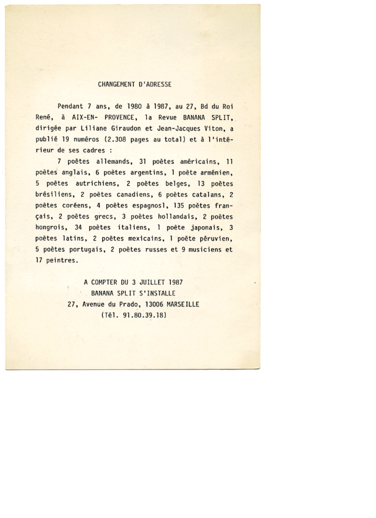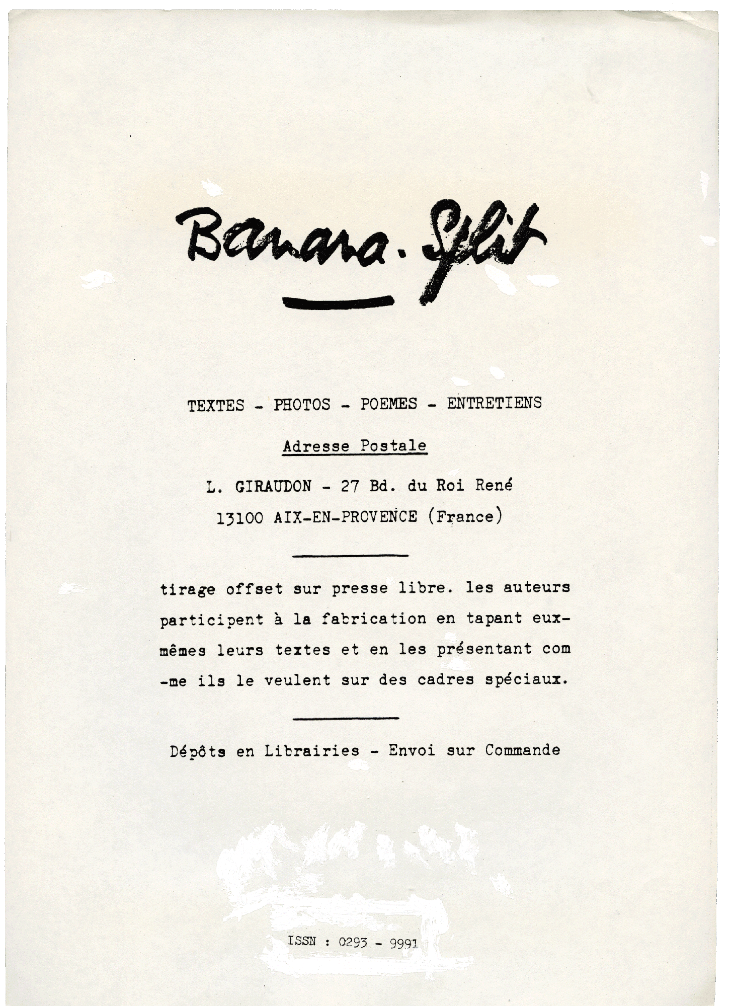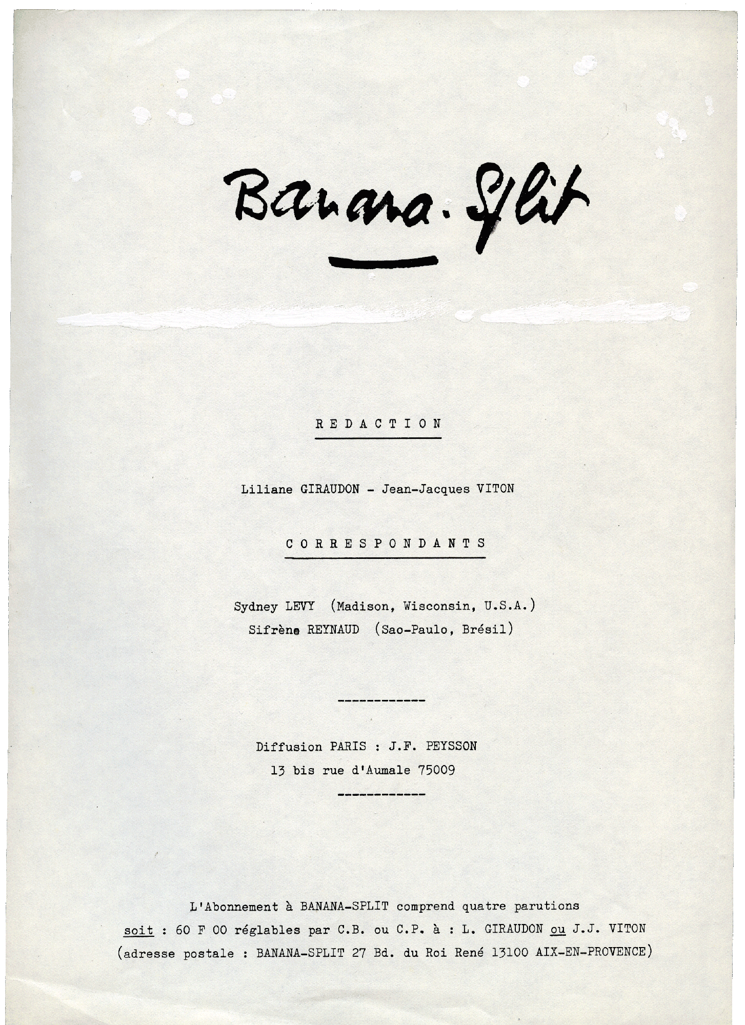 ARCHIVE BANANA SPLIT : UNE ARCHIVE ACCESSIBLE Archive Banana Split est une publication des Editions Salon du Salon qui répertorie l'ensemble des contributions de plasticien.ne.s à la Revue Banana Split, fondée et menée par Liliane Giraudon et Jean-Jacques Viton entre 1980 et 1990.