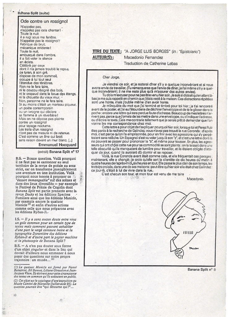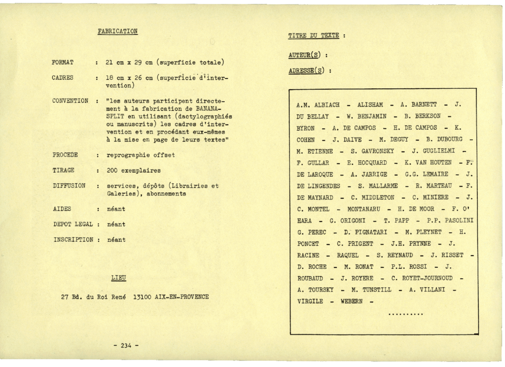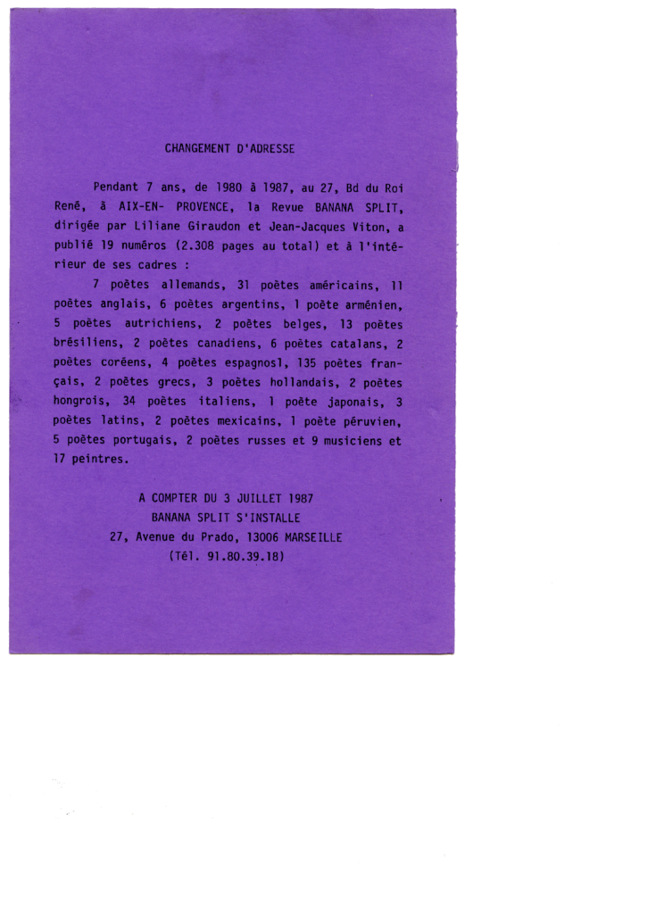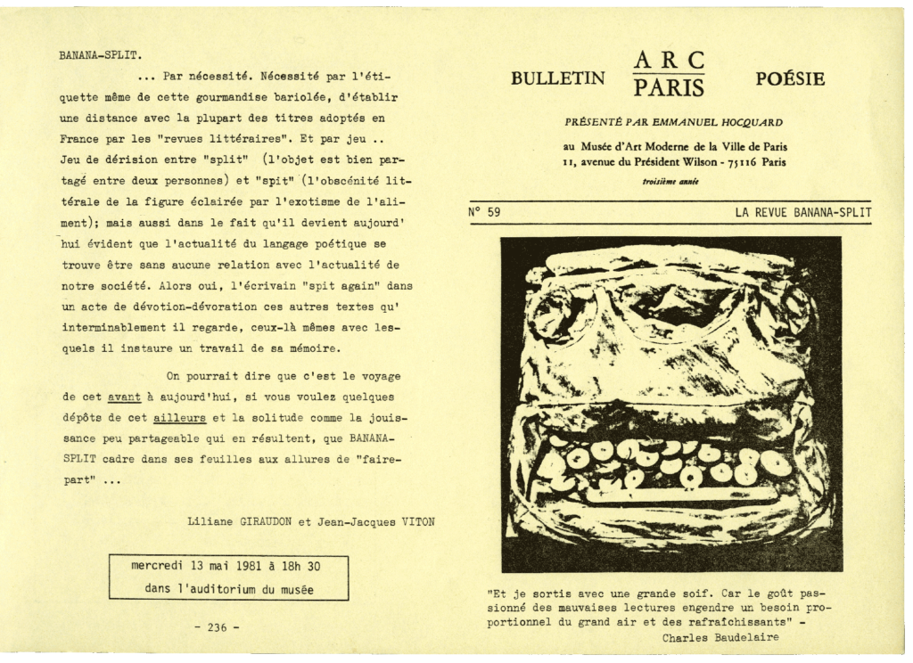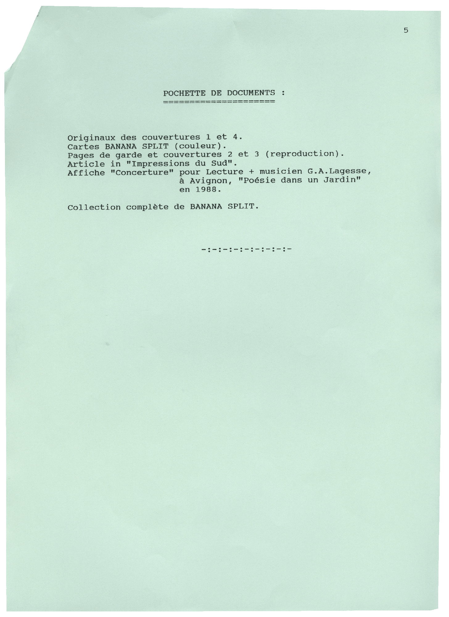 ARCHIVE BANANA SPLIT : UNE ARCHIVE ACCESSIBLE Archive Banana Split est une publication des Editions Salon du Salon qui répertorie l'ensemble des contributions de plasticien.ne.s à la Revue Banana Split, fondée et menée par Liliane Giraudon et Jean-Jacques Viton entre 1980 et 1990.